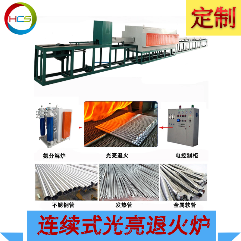 該裝置主要由傳動系統、加熱系統、冷卻系統、控制系統、氨分解供氣系統組成。馬弗爐采用進口耐高溫鎳合金壓焊而成;可拆裝的電熱元件可上下加熱;鋼帶輸送無級調速;液氨分解得到的氣體混合物(氫75%、氧25%)進入爐缸,達到氣體保護效果;氣體方向調節裝置,保證大氣穩定。經過這種爐處理后,產品表面會變得光亮,不會被氧化。所有經過處理的產品將達到良好的一致性。